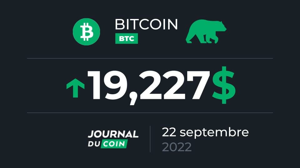 Le prix du Bitcoin monte jusqu’aux 19 316 $ sur Bitfinex aujourd’hui, 22 septembre 2022. La cryptomonnaie se négocie à 19 227 $ au moment de la rédaction de cet article. Son cours enregistre actuellement un gain quotidien de 4,06 %.