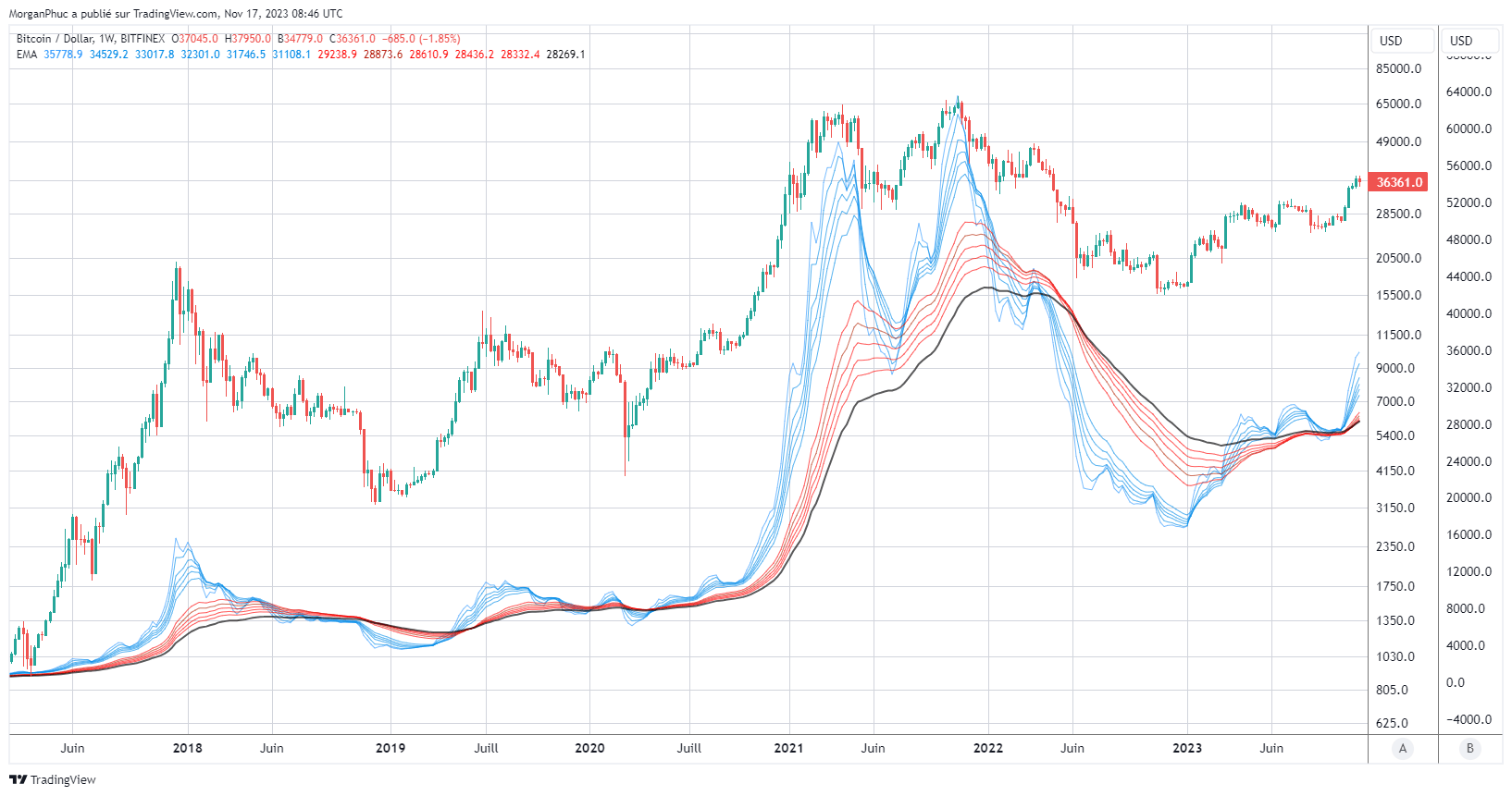 Même en utilisant des moyennes mobiles exponentielles, l’indicateur montrera une certaine latence. Il y aura toujours des phases où l’action du cours sera bien en avance sur le ruban. C’est le cas par exemple sur Bitcoin dans les période de frénésie acheteuse. Dans ce cas, le ruban ne fera que suivre l’action du prix avec un peu de retard.