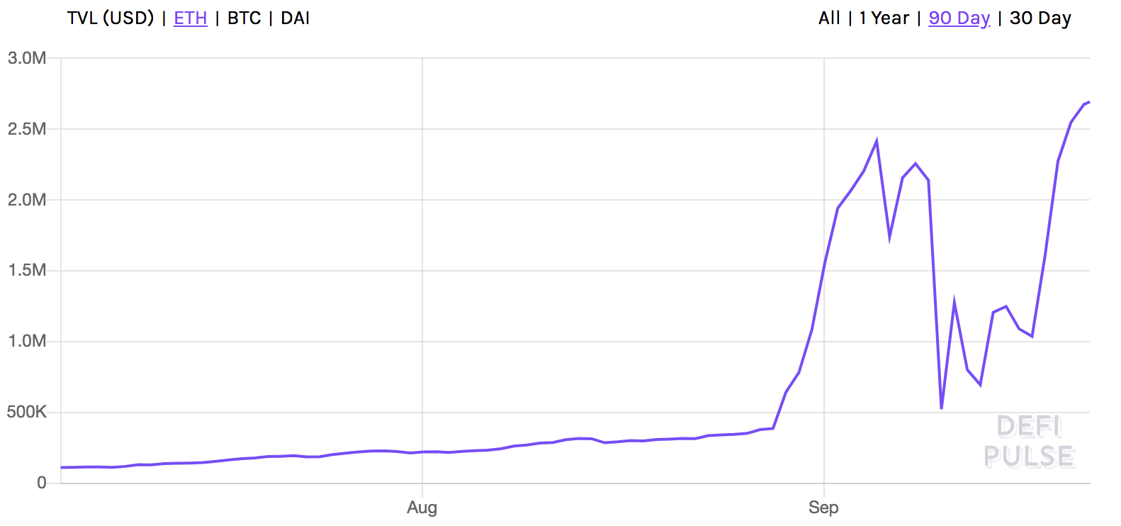 Ainsi, entre le 16 et les 20 septembre, ce sont plus de 1,45 million d’ETH qui ont transité vers les pools d’Uniswap, d’après les données de DefiPulse.