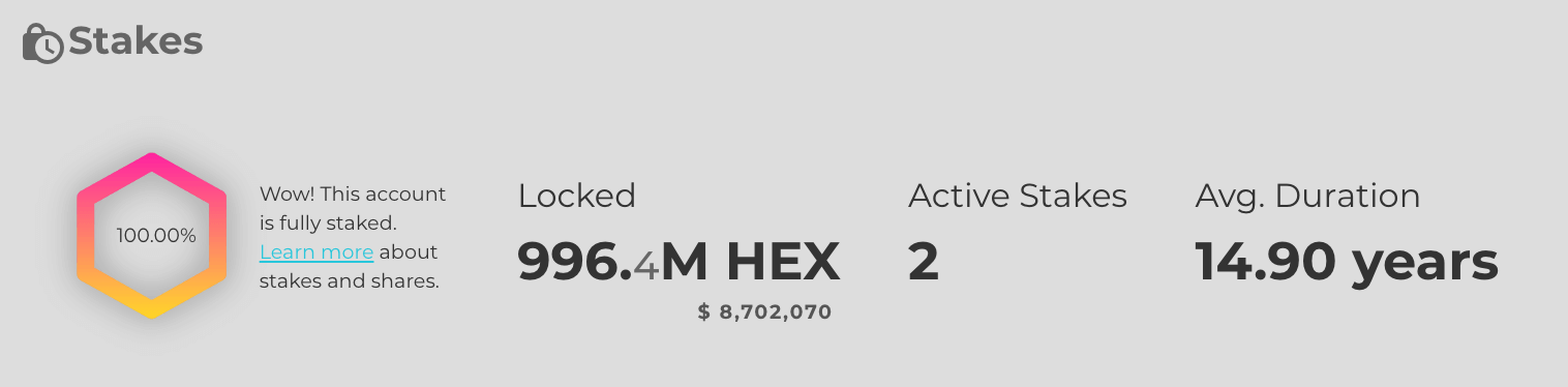 Ainsi, l’utilisateur a déposé 20 000 ETH, soit environ 8,7 millions de dollars, qui seront bloqués sur la plateforme HEX pour les 15 prochaines années, à savoir jusqu’en 2034.
