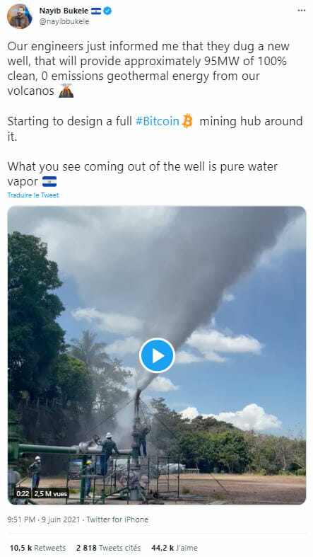 Un minage carburant au volcan – Le président salvadorien, Nayib Bukele, devenu porte-étendard de Bitcoin (BTC), a offert un aperçu de ce à quoi pourrait ressembler l’exploitation minière de BTC alimentée par un volcan. Avec des tweets réguliers, il continue de partager sa vision de l’avenir de son pays.