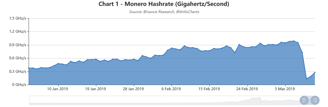 Premier constat de cette étude de Binance Research, la puissance de calcul totale (le hashrate) sur Monero a bien chuté de plus de 75% après le fork anti-ASIC début mars.