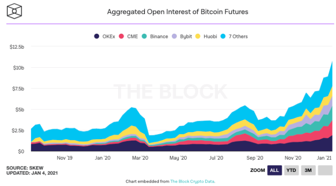 Ainsi, le dimanche 3 janvier, l’open interest sur les futures Bitcoin ont atteint un nouveau record de 10,71 milliards de dollars.