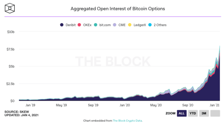 Même phénomène du côté des options Bitcoin, où l’open interest a atteint les 7,96 milliards de dollars. Marché largement dominé par Deribit, qui est à l’origine de 6,58 milliards.