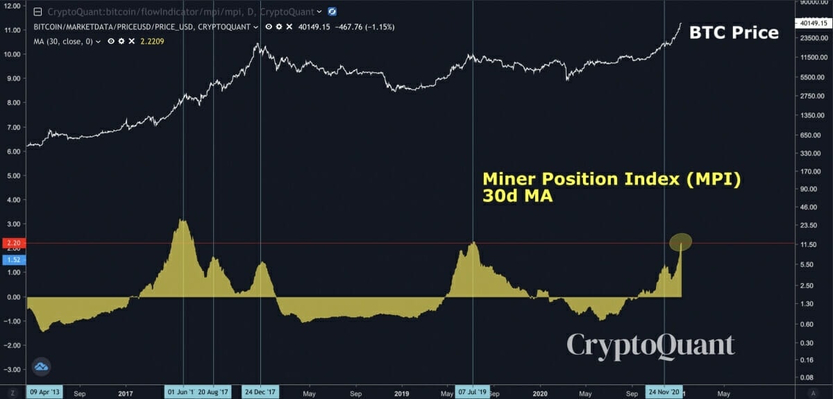Il semble donc que la baisse ait été déclenchée par d’importantes ventes en spot, qui ont provoqué la liquidation des positions à levier pariant à la hausse. Certainement métriques, comme le Miner’s Position Index – qui mesure le flot de bitcoins quittant les portefeuilles des mineurs -, indiquent que les mineurs auraient contribué à cette baisse.