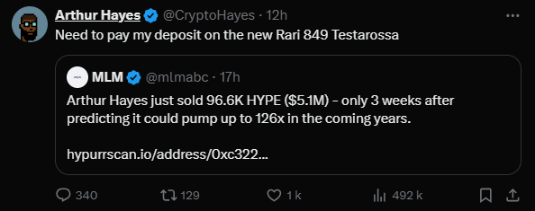 - Arthur Hayes a surpris la communauté crypto en vendant tous ses tokens HYPE pour, soi-disant, financer l’achat d’une Ferrari Testarossa.