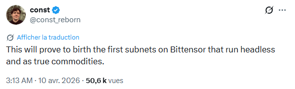 « Cela donnera naissance aux premiers sous-réseaux sur Bittensor qui fonctionneront sans tête (headless) et comme de véritables marchandises (commodities). »