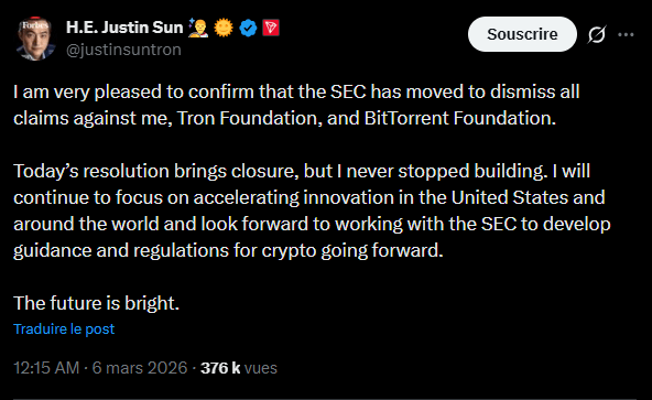 Le règlement intervient dans un climat de changement profond à la tête de la SEC. Le départ de Gary Gensler, partisan d’une ligne dure envers le secteur crypto, semble avoir ouvert la voie à un recalibrage des actions répressives du régulateur. Justin Sun, qui reste une figure centrale de l’écosystème notamment par ses liens récents avec le projet World Liberty Financial soutenu par des alliés de Donald Trump, voit ainsi disparaître l’une des principales incertitudes réglementaires qui pesaient sur ses activités.