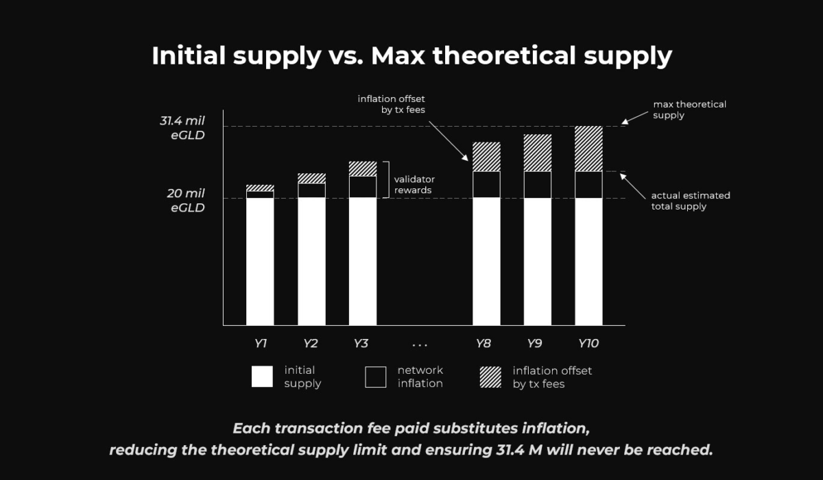 En effet, à l’inverse de Bitcoin, les possesseurs d’eGLD peuvent staker leurs tokens afin de sécuriser le réseau (POS vs POW), tout en profitant d’une incitation financière. C’est pourquoi l’émission de tokens sera en toute logique supérieure aux 20 millions de jetons proposés initialement. Ce surplus entre « l’émission initiale » et « l’émission théorique maximum » se réduira au fur et à mesure de l’adoption. Le protocole brûlera automatiquement une partie des tokens, sous forme de frais de transactions.