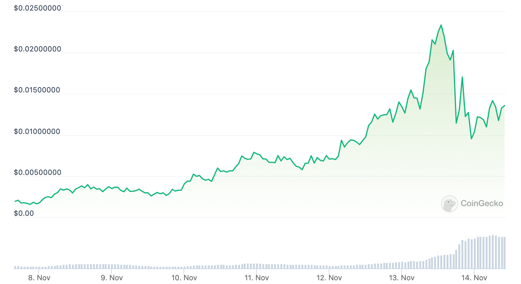 Résultats, une hausse de plus de 1000 % pour ce jeton lancé le 7 novembre dernier. Et un volume de transaction supérieur à 112 millions de dollars depuis sa création. Avec un plus haut enregistré le 13 novembre à 0,023 $.