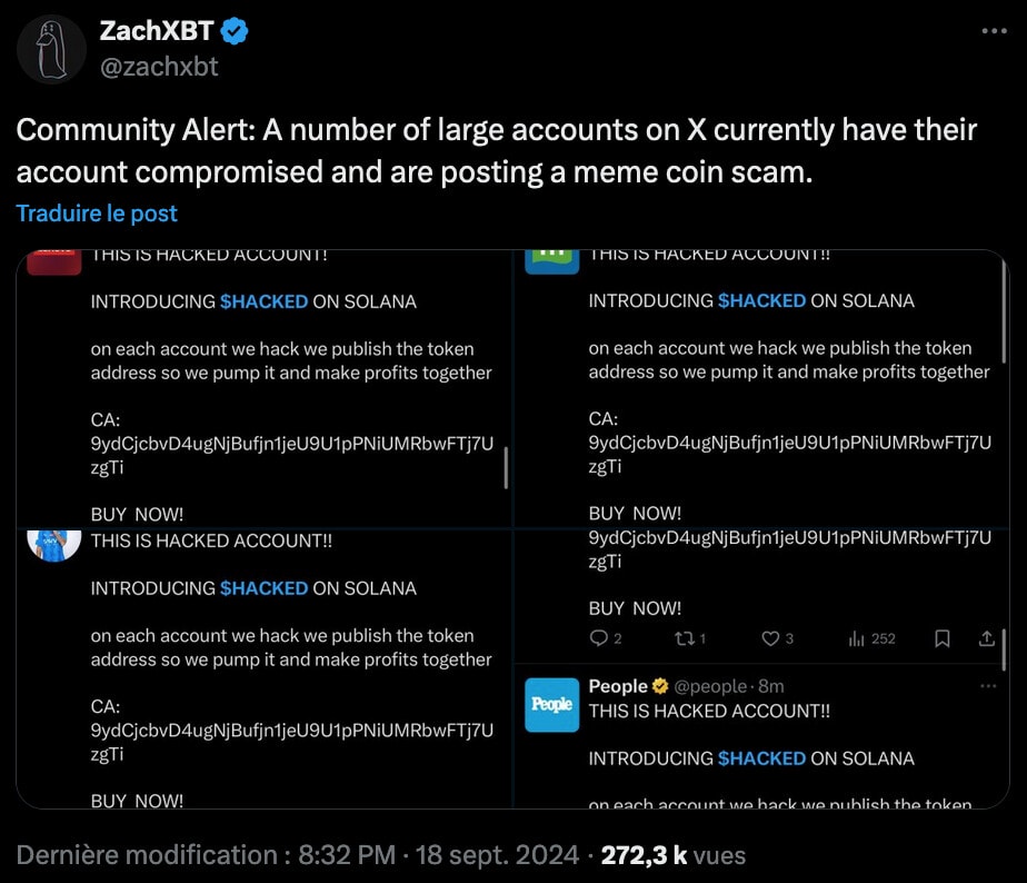 Ainsi, il a dévoilé que plusieurs comptes X avaient été victime d’un piratage d’envergure. Sans grande surprise, les comptes hackés ont fait la promotion d’un memecoin sur la blockchain Solana.