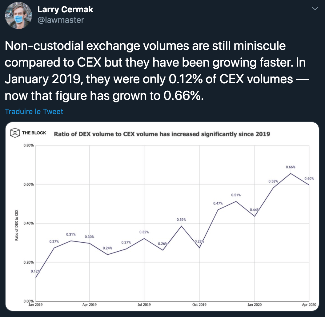 ➤ 0,66%, c’est la part des échanges attribuée aux plateformes d’échanges décentralisées. Bien que cette part soit minime, elle a connu une hausse de 450% depuis janvier 2019.