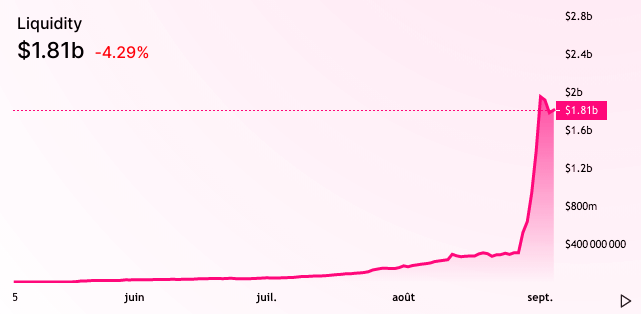 ➤ 1,81 milliard : c’est le total de liquidités disponible sur la plateforme d’échanges décentralisés, Uniswap. Celle-ci a même quasiment atteint les 2 milliards le 2 septembre.