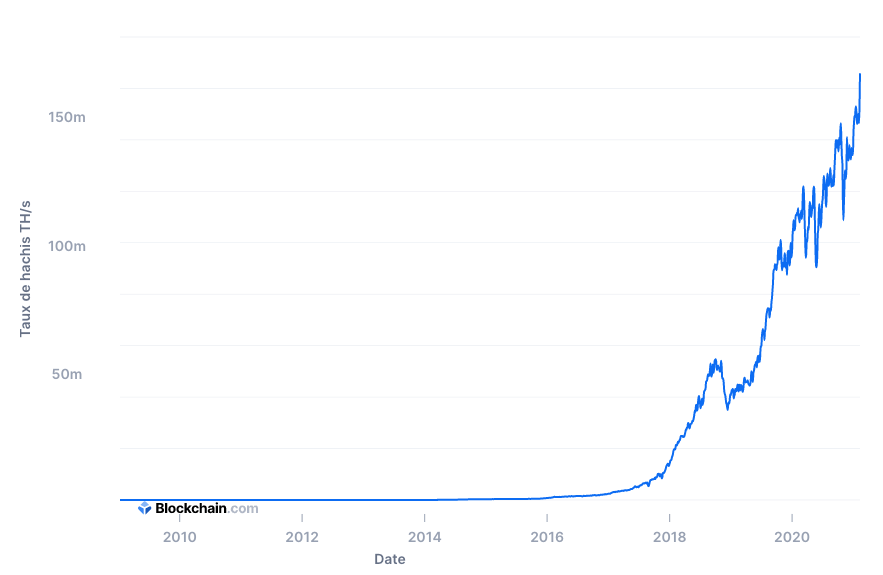 ➤ 165 861 millions de TH/s, c’est le nouveau record de hashrate enregistré par le réseau Bitcoin. En pratique, celle-ci a plus que doublé depuis janvier 2020.