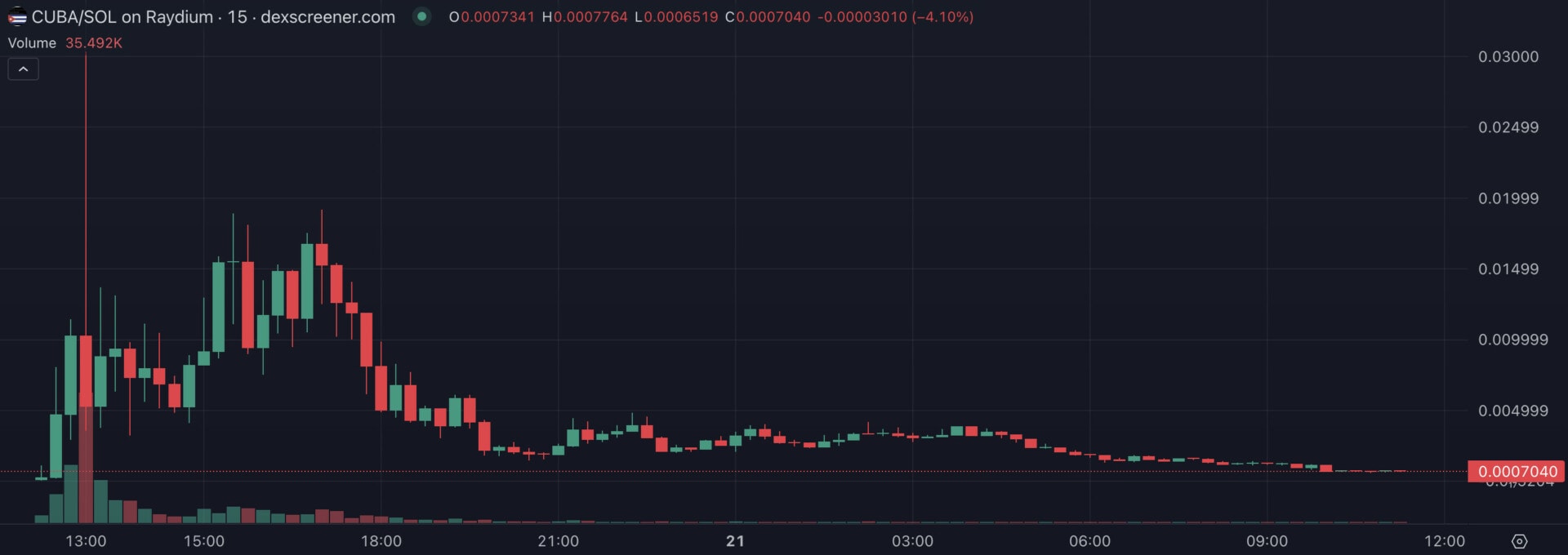 Quoi qu’il en soit, le memecoin CUBA a connu un succès fulgurant en atteignant rapidement une capitalisation de 30 millions de dollars. Mais la fête a été de courte durée. En effet, le jeton à ensuite été victime de ce qui ressemble à un rug pull. Une arnaque où les créateurs revendent massivement leurs jetons, laissant les investisseurs face à un prix en chute libre.