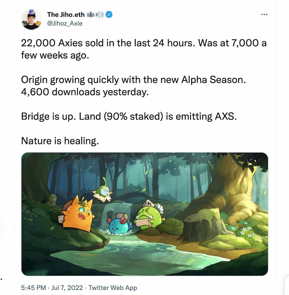 « 22 000 Axies vendus dans les dernières 24 h. On était à 7 000, il y a quelques semaines. Origin se développe rapidement avec la nouvelle saison Alpha. 4 600 téléchargements hier. Le pont est en place. Land (90 % jalonné). La nature guérit. »