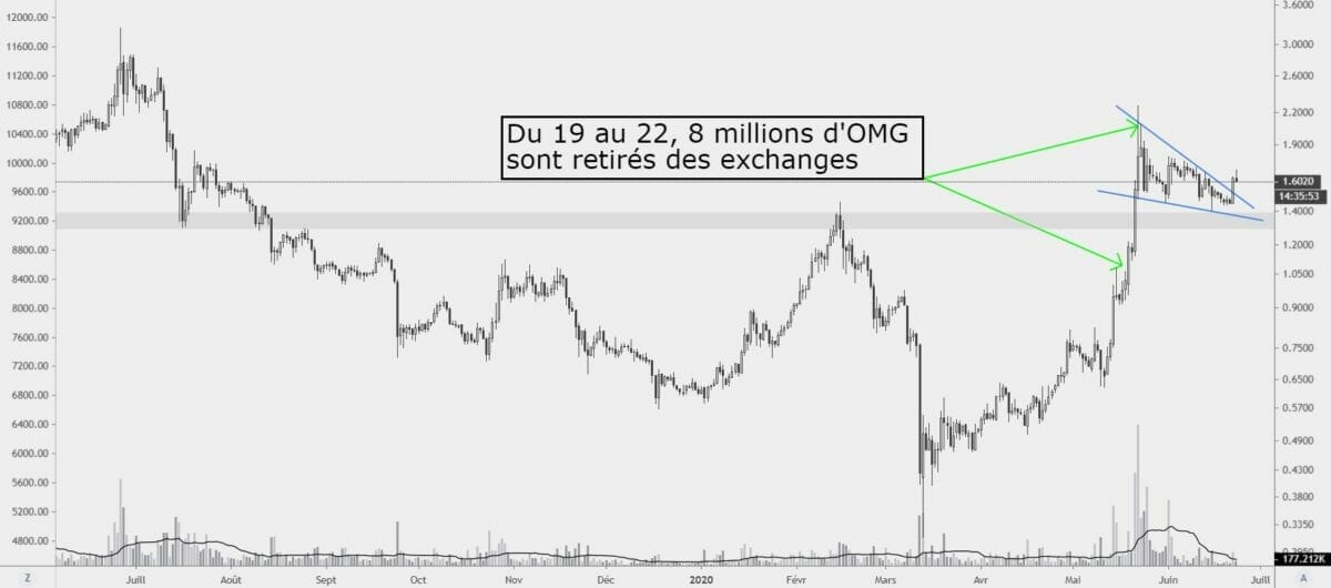 La corrélation est frappante : lors de la hausse de la paire OMGUSD, énormément d’OMG ont été retirés des plateformes de change. C’est au total 25% de l’offre disponible d’OMG sur les exchanges qui a disparu dans la nature.
