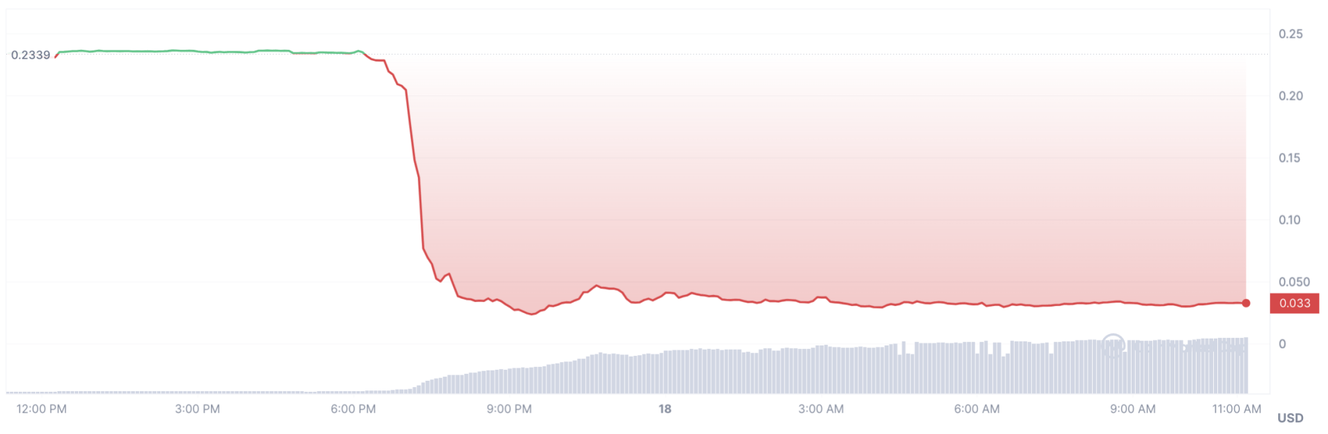 En effet, sur les dernières 24 h, les deux principaux jetons communautaires du site Reddit enregistrent un effondrement catastrophique. Il suffit de voir le graphique du MOON (r/CryptoCurrency Moons) dont le nom très prometteur ne l’empêche pas d’afficher une perte supérieure à 85 %. Une situation similaire, mais un peu moins dramatique, pour le BRICK (r/FortNiteBR Bricks) qui affiche de son côté -46 % sur la même période.