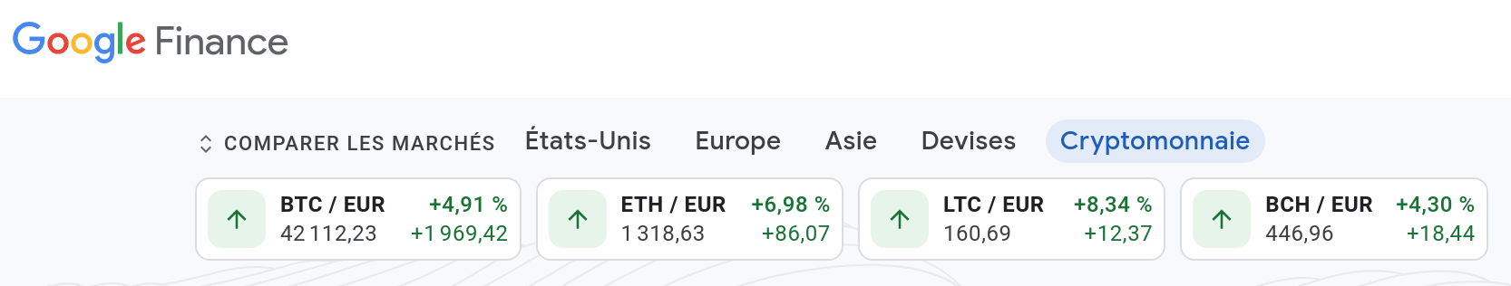 L’outil Google Finance intègre désormais un onglet « Cryptomonnaies » aux côtés des marchés mondiaux traditionnels. Cette nouvelle section permet de visualiser le cours face au dollar de 4 cryptos, à savoir Bitcoin, Ethereum, Litecoin et Bitcoin Cash.