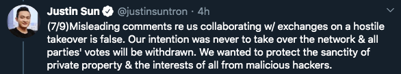 Un peu comme un petit frère qui se fait embêter à l’école, Justin Sun n’a pas vu d’un très bon œil ce putsch visant à l’écarter du processus de vote de la blockchain qu’il venait d’acquérir.