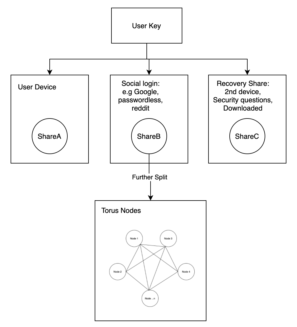 La gestion des clés privées combine l’appareil de l’utilisateur, une entrée privée et/ou une méthode d’authentification « classique » (compte Google, adresse email, Twitter, Reddit, etc.). Tout repose sur les nœuds Torus dont nous parlerons plus loin. Tant que l’utilisateur a accès à 2 de ces 3 entités, il a le contrôle de ses clés privées.