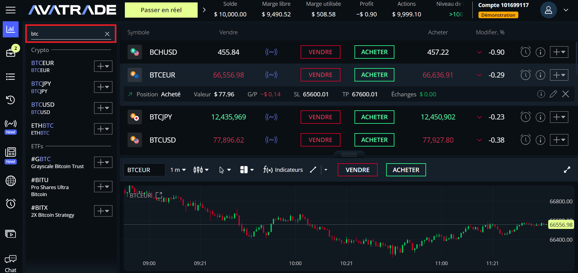 Rien de tel qu’un exemple pour comprendre la puissance de Metatrader 5. Ici, nous utiliserons la plateforme AvaTrade, un courtier régulé mondialement (AMF, FCA, ASIC, CySEC) qui l’intègre nativement avec une large sélection de CFD sur cryptomonnaies.