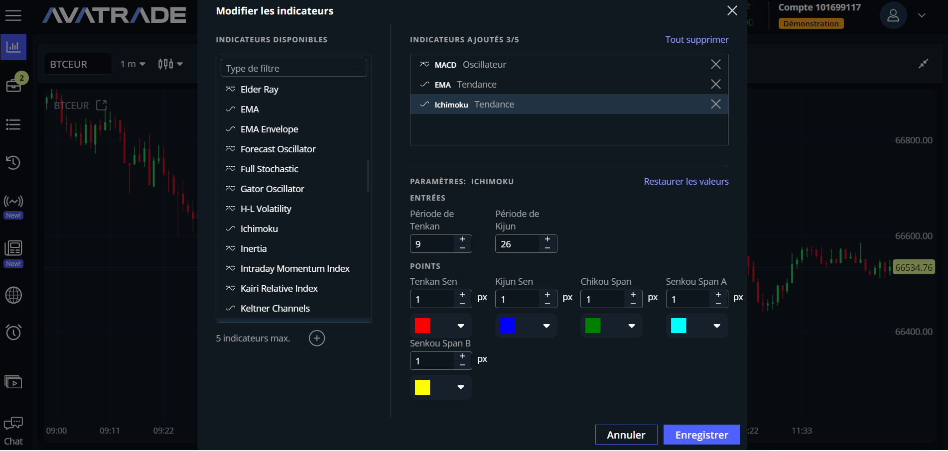 Vous pouvez en afficher jusqu’à 5 simultanément sur votre graphique. Choisissez ceux dont vous avez besoin dans la liste de droite, double-cliquez pour les ajouter et validez avec « Enregistrer ».