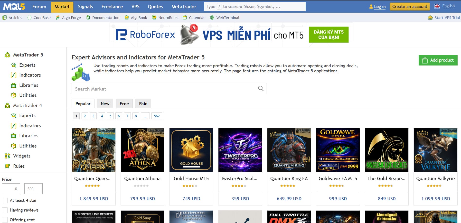 - Télécharger des EAs prêts à l’emploi depuis la Marketplace MetaTrader 5 ;