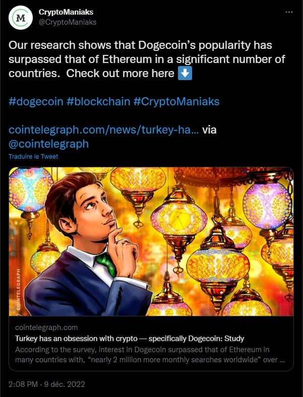 Mais ce qui surprend le plus dans cette enquête est la première place de la Turquie quand on prend en compte les recherches sur le Dogecoin. Avec 812 000 recherches mensuelles, c’est plus que partout ailleurs dans le monde et presque le double que celles d’Ethereum, la troisième au classement dans le pays derrière Bitcoin et Dogecoin. Un porte-parole de CryptoManiaks constate effectivement la popularité de la crypto préférée d’Elon Musk sur la dernière année :