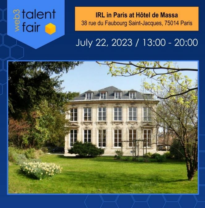 En marge de l’ETHCC6, qui se tiendra à Paris du 17 au 20 juillet et qui rassemblera la crème de la communauté Ethereum, un autre événement plutôt original a retenu notre attention. Au sein d’un magnifique hôtel particulier du XVIIIᵉ, situé dans le 14ᵉ arrondissement de la capitale, le Web3 Talent Fair se propose de mettre en relation les professionnels du secteur avec les talents dont ils ont besoin pour construire le monde de demain. Cela se passera le 22 juillet de 13 h à 20 h à l’Hôtel Massa.