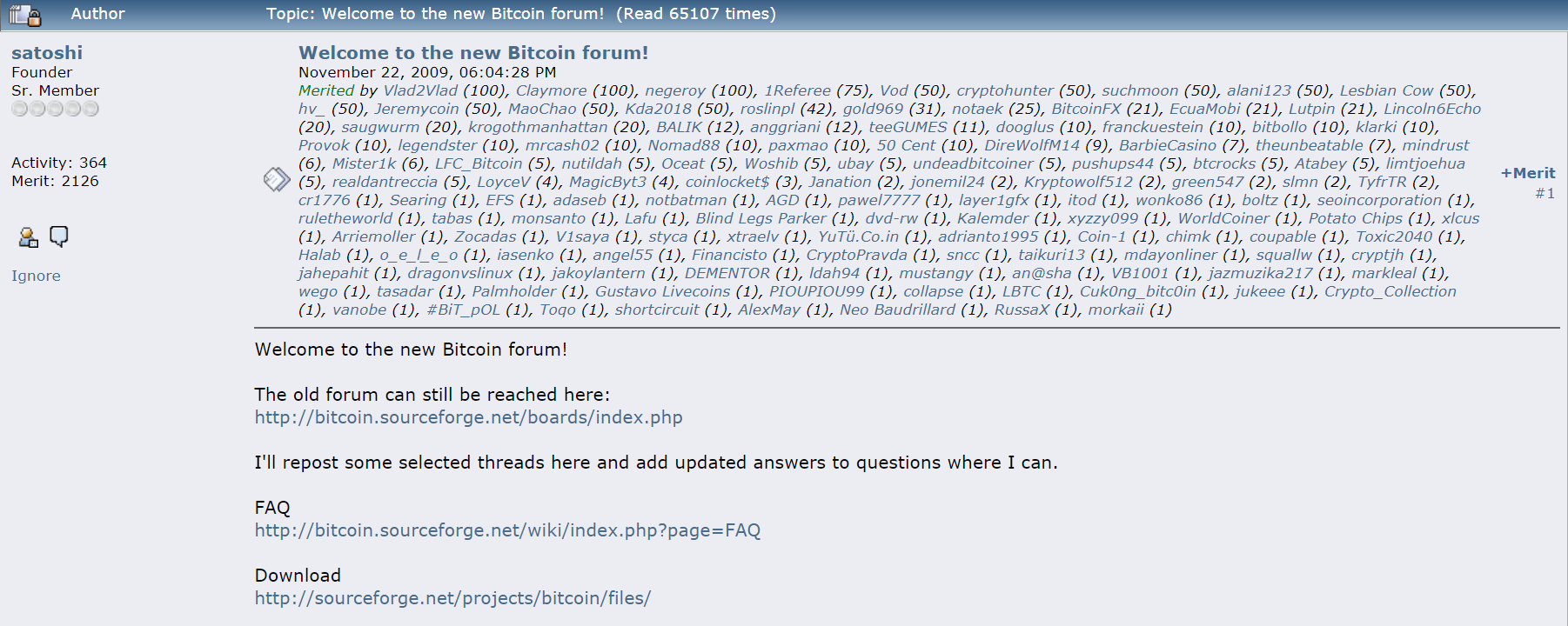 Le 22 novembre 2009, Satoshi Nakamoto souhaite la bienvenue aux premiers inscrits sur le Bitcoin Forum: