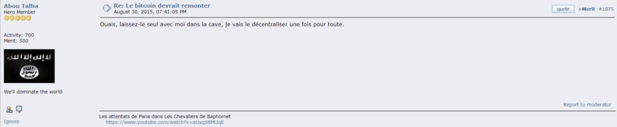 Mais il est temps maintenant de descendre dans les tréfonds du forum afin de voir ce qui s’y cache. Histoires de gros sous, luttes de pouvoir, piratages et apologie du terrorisme, bienvenue dans le dark side de Bitcointalk !