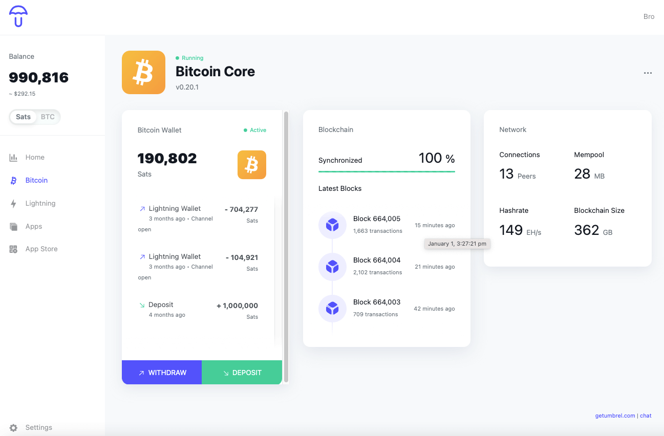 Ayant débarqué courant 2020, Umbrel est un projet qui veut faciliter la configuration et l’utilisation au quotidien d’un nœud complet Bitcoin. Avec un accent mis sur l’expérience utilisateur et la qualité de l’interface, ce nouveau projet presque plug-and-play entend donner à chacun l’opportunité de jouir de sa souveraineté monétaire individuelle.