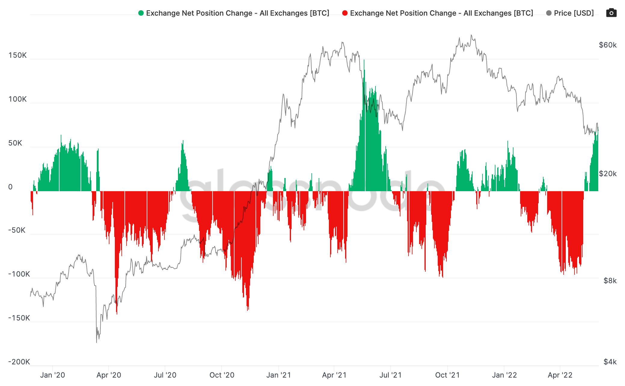 Après avoir connu une longue période où le Bitcoin a été retiré des exchanges, il semblerait que les acteurs déposent actuellement une quantité non-négligeable en BTC sur les plateformes pour de la vente. La periode reste majoritairement marquée par des retraits, mais il ne faudrait pas que ce changement de comportement persiste.