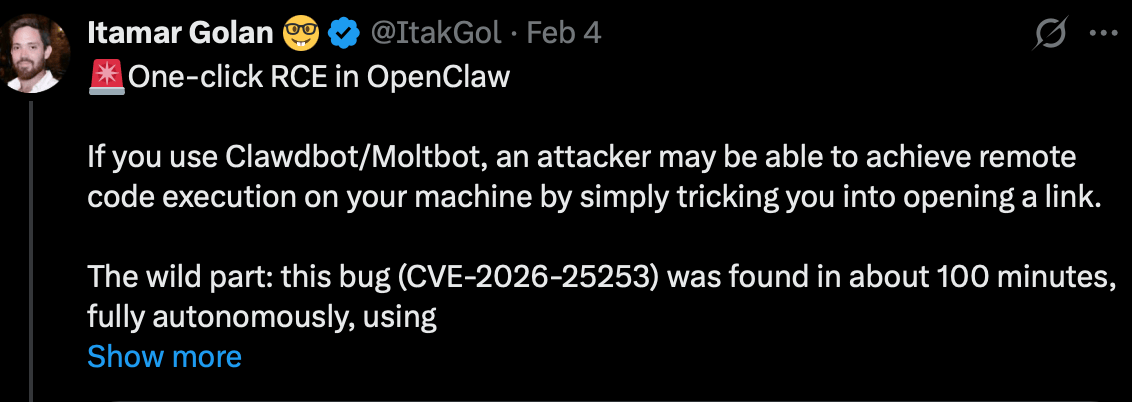 Mais ça va plus loin : une vulnérabilité critique, CVE-2026-25253, permet un « one-click RCE » (remote code execution) qui permet à l’attaquant de changer une URL et de voler votre token d’authentification, menant à un contrôle total de la machine en millisecondes. Cela a été patché depuis la version 2026.1.29, mais des instances vulnérables traînent encore.