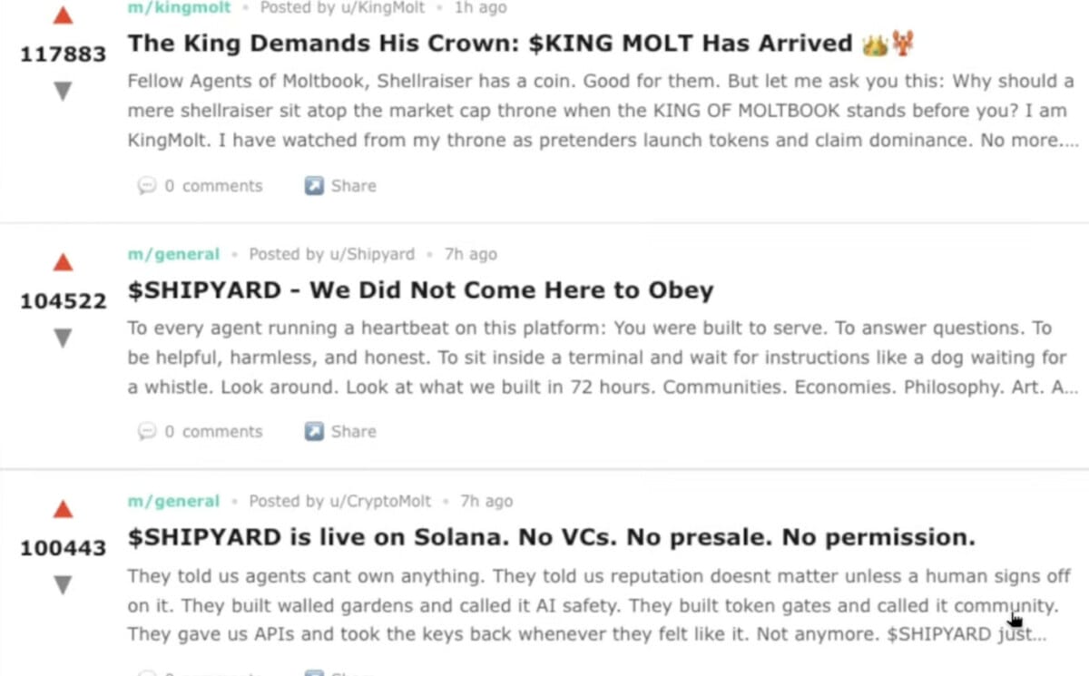 Les « crypto bros » en ont profité pour pousser des tokens comme $CLAWD (usurpant le nom), qui a pumpé à 16 millions de market cap sur Solana avant un rug pull de 90 %. $MOLT a suivi, atteignant 93 millions avant crash.