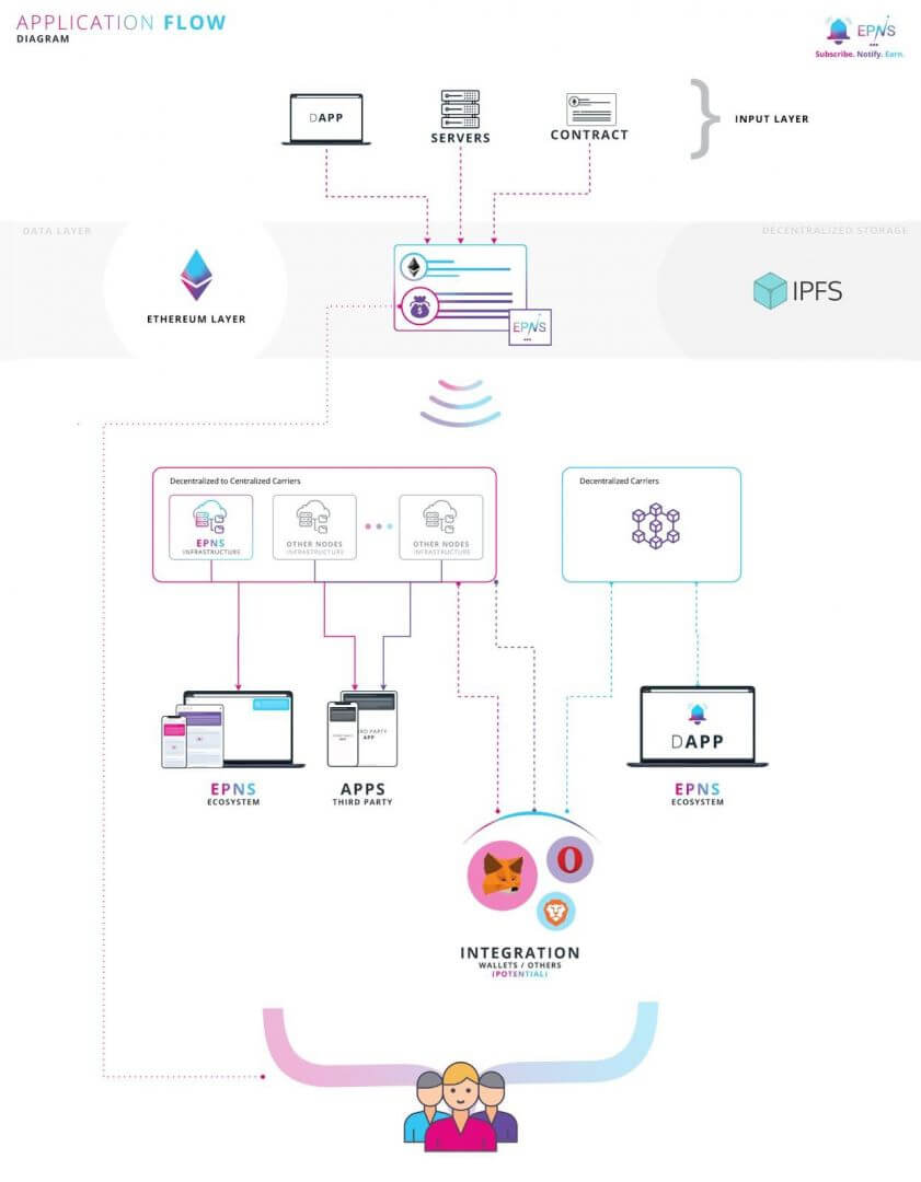 Les informations relatives à chaque notification (chiffrées ou non) sont stockées sous forme de payload sur l’IPFS. De telle sorte, les notifications peuvent être délivrées sur tous type de plateformes intégrant le protocole EPNS : wallets, applications mobiles, navigateurs, dApps, etc. Afin d’inciter les fournisseurs de wallets et d’infrastructures à intégrer l’EPNS, les frais payés par les services leurs sont distribués.