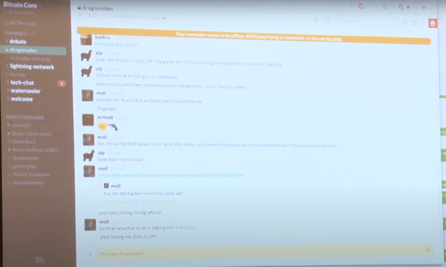 dragonsden sur le groupe Slack de Bitcoin CoreIl s’agit d’un canal sur le groupe Slack de Bitcoin Core qui est appelé « Dragons’ Den », en référence à l’émission de téléréalité britannique du même nom où des entrepreneurs présentent leurs idées à un jury de multimillionaires (les « dragons ») pour être financés. En janvier, ce canal comportait déjà 21 membres dont BashCo (modérateur de r/bitcoin), Chris Belcher (JoinMarket) et btcdrak (contributeur pour Bitcoin Core).