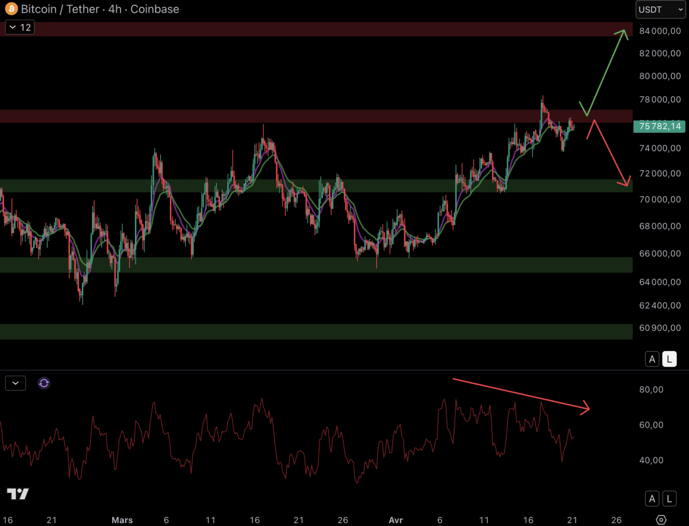 Un rejet pourrait conduire à un retour sur le support à 71 000 $. Cependant, si les acheteurs parviennent à faire plier les vendeurs, une hausse vers la prochaine résistance à 84 000 $ est envisageable. L’indicateur RSI enregistre des divergences baissières, et cela indique donc un essoufflement du mouvement haussier à court terme.