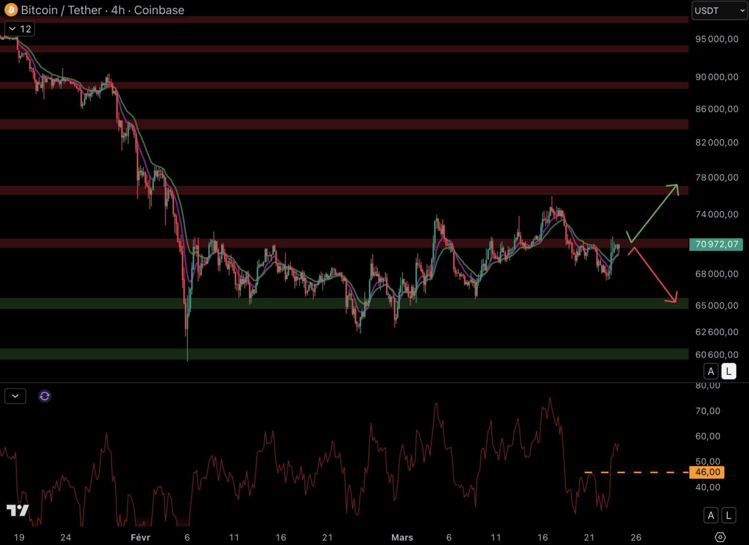 Avec ce rebond, le cours du Bitcoin se retrouve contre la résistance à 71 000 $ et au-delà des moyennes mobiles (EMA 9/EMA 18). Ce niveau de résistance doit être cassé pour que la hausse se poursuive :