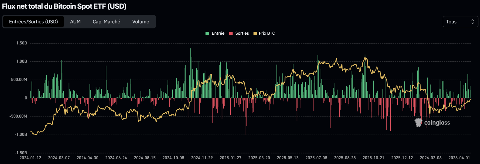 Les entrées restent en deçà des niveaux enregistrés en 2024 et 2025, mais la dynamique récente confirme un retour progressif de l’appétit institutionnel pour le Bitcoin. Et cela pourrait permettre au BTC de poursuivre son ascension.