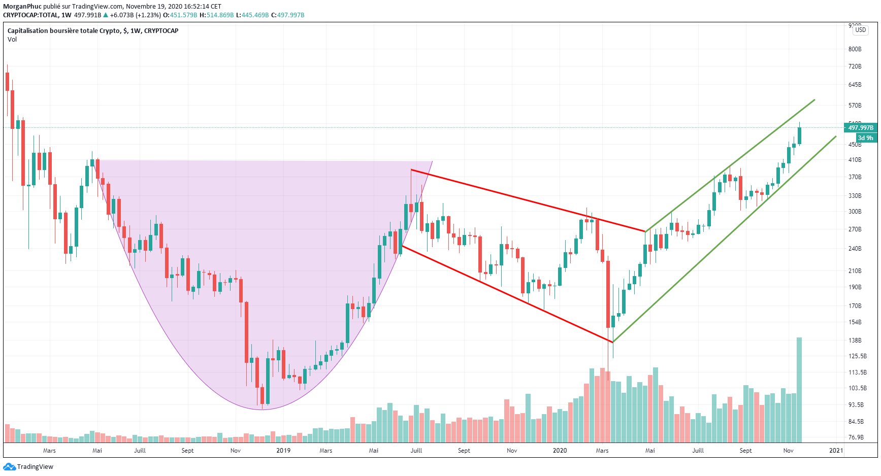 En parlant de tasse de thé, le marché des cryptomonnaies vient de former une magnifique figure chartiste nommée cup and handle ou coupe et poignée. C’est une figure fortement haussière, annonçant une croissance extensive.