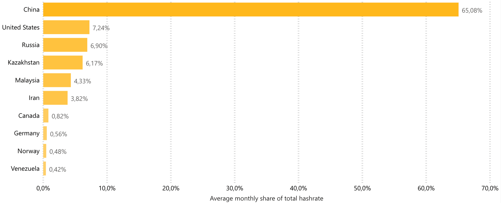 La nouvelle n’a rien étonnant, la Chine arrive en tête avec 65% de la puissance de hachage totale. Elle est suivie, loin derrière, par les États Unis avec 7,24% et la Russie avec 6,9%.