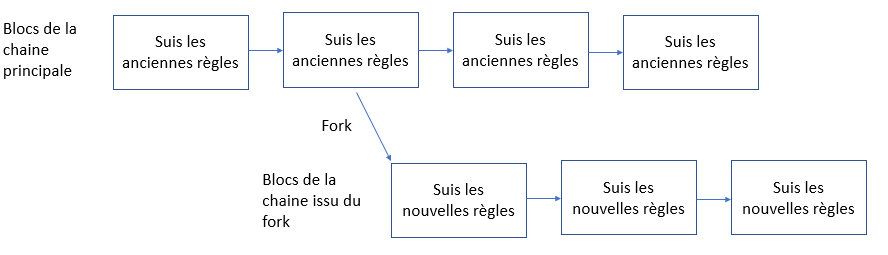 Il y a deux types de forks possible, les soft-forks et les hard-forks. Le premier va être une mise à jour du logiciel permettant aux nœuds et aux mineurs de fonctionner, dans ce cas, il n’y a pas divergence de chaîne seulement des ajouts de fonctionnalités. La nouvelle version est adoptée quand une majorité de nœuds a fait la mise à jour. Par exemple, sur la chaîne Bitcoin, SegWit est un soft-fork. Dans ce cas, il y a rétro-compatibilité, les nœuds non mis à jour peuvent quand même accepter les nouveaux blocs.