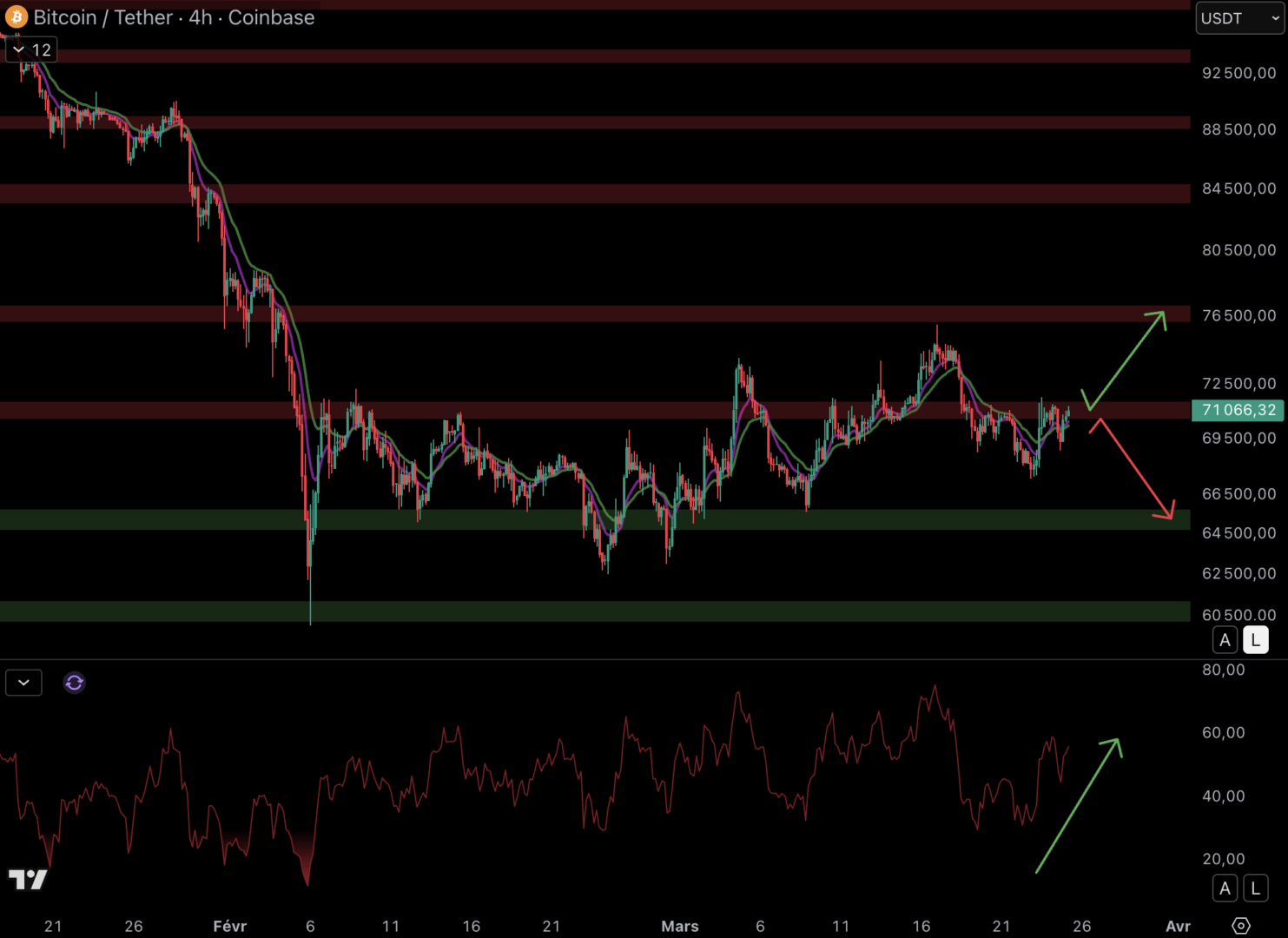Le RSI évolue à la hausse, donc le momentum est à l’avantage des acheteurs. Néanmoins, si le cours bloque une fois de plus sur cette résistance, il pourrait chuter vers le support à 65 000 $.