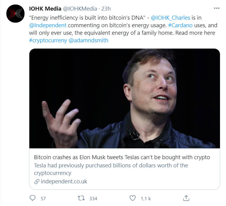 Un tweet de la société IOHK, en charge du développement du projet Cardano, vient appuyer sur ce point, et cite une déclaration de son cofondateur Charles Hoskinson faite peu après celle d’Elon Musk :