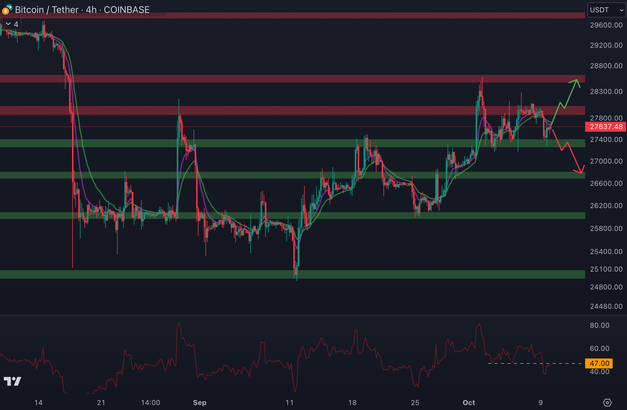 En cas de cassure du support, le cours pourrait alors rejoindre le prochain support situé à 26 700 $. En revanche, si les acheteurs poussent et arrivent à dépasser la résistance à 27 900 $, le cours pourrait revenir au niveau de la résistance à 28 500 $. Le cours devra trouver le moyen de casser la résistance à 28 500 $ pour tenter de revenir au niveau du chiffre rond à 30 000 $. Le RSI affiche à nouveau une dynamique baissière depuis la clôture en dessous de 47. Les vendeurs ont le momentum.