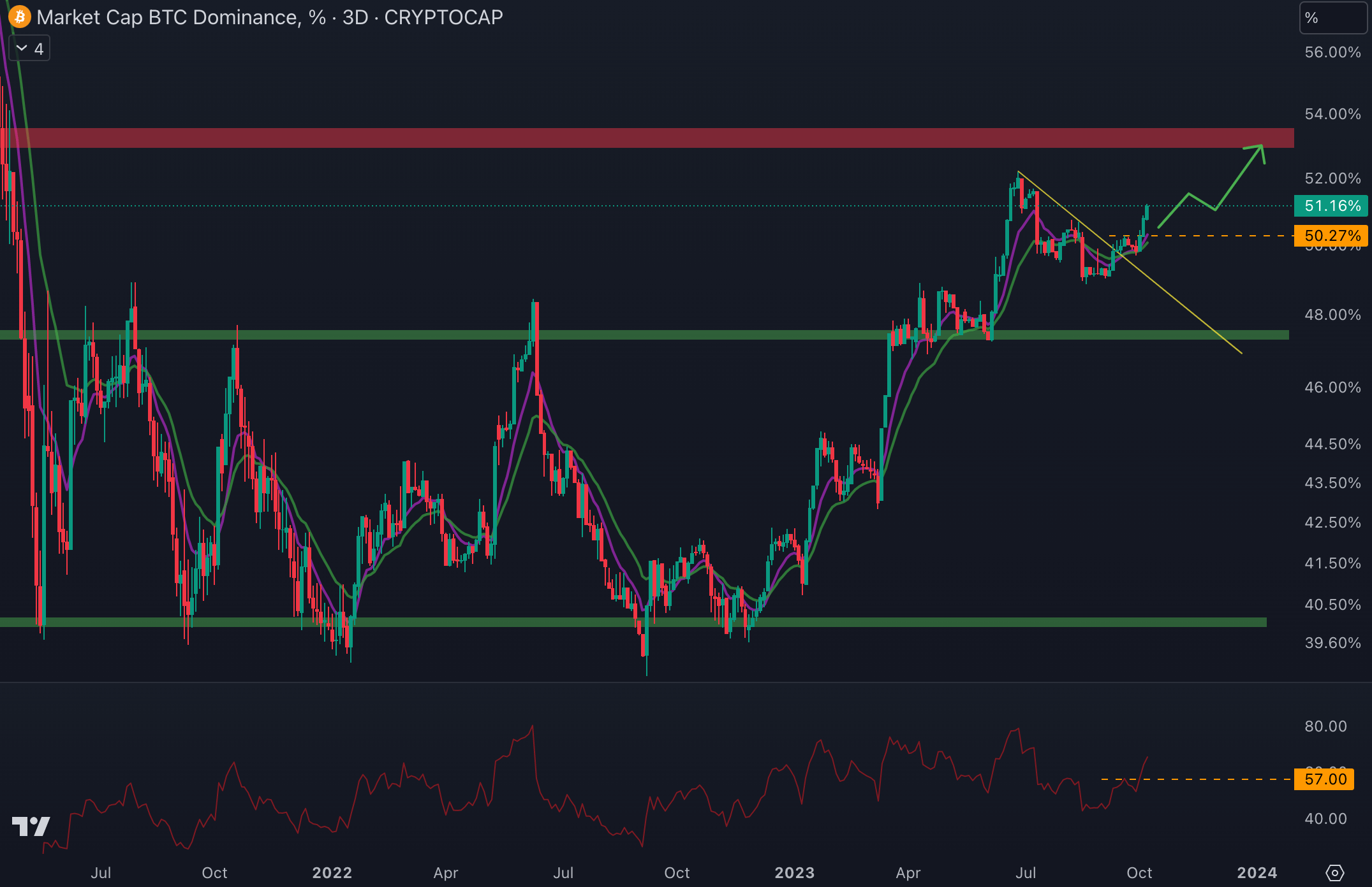 Ainsi, après une période d’hésitation, les capitaux se dirigent à nouveau vers le BTC. Le cours affiche à nouveau une dynamique avec des creux et des sommets ascendants. Il pourrait rejoindre la prochaine résistance située autour de 53 %. Tant que la dominance grimpe, les altcoins auront du mal à s’exprimer.