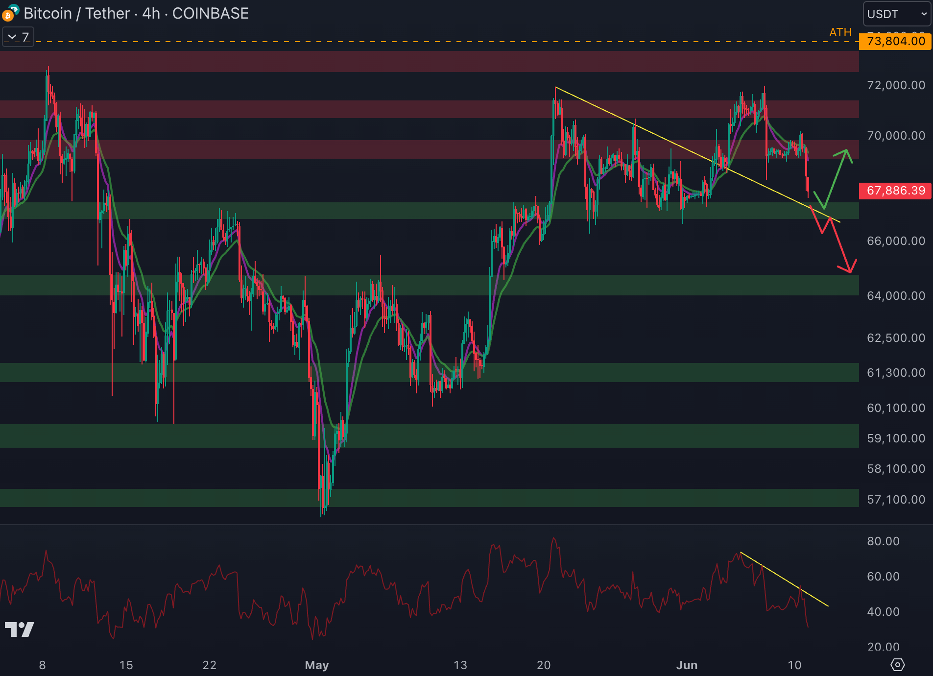 Après avoir bloqué sur la résistance à 71 000 $, le cours a chuté sous le niveau de support à 69 500 $. Par conséquent, le cours du BTC se dirige rapidement vers le support à 67 000 $ :