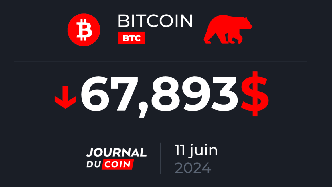 Les vendeurs continuent de mettre la pression sur le cours du Bitcoin. De fait, le BTC chute sous les 68 000 $ et affiche une baisse de 2,5 % en 24 heures :